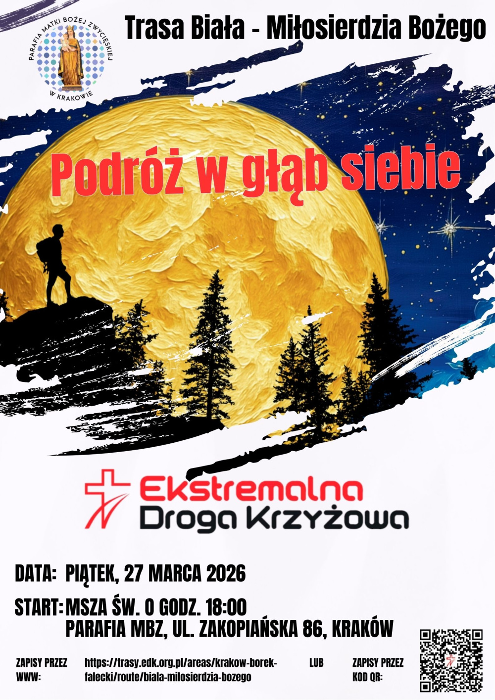 Ekstremalna Droga Krzyżowa trasą Białą – Miłosierdzia wyruszy z naszego kościoła w piątek 27 marca po Mszy św. o godz. 18:00. Trasa zaczyna się i kończy w naszym kościele. Szczegóły i zapisy na stronie głównej EDK. Zapraszamy!